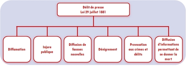 Comme toute autre forme de communication au public, la publicité en ligne ne peut pas ignorer les infractions relevant du délit de presse. La loi du 29 juillet 1881 sur la liberté de presse instaure un ensemble d’infractions par voie de presse s’étendant à tout moyen de publication. Les principaux délits prévus et réprimés par le chapitre IV de la loi (article 23 et s.) sont :