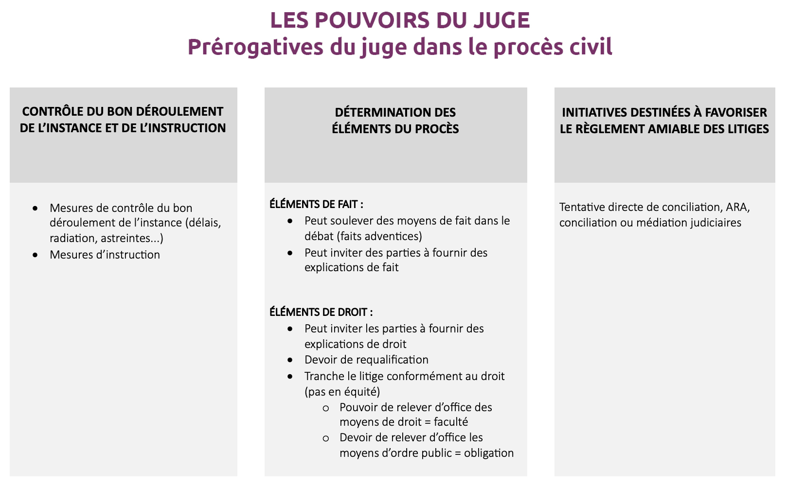 Le juge veille au bon déroulement de l'instance et joue aussi un rôle dans la détermination des éléments de fait et de droit du litige. Si la jurisprudence a limité son devoir d'initiative d'office dans le domaine du droit, les textes ont peu à peu accru ses prérogatives en matière de mise en état ou en vue de favoriser le règlement amiable des litiges.